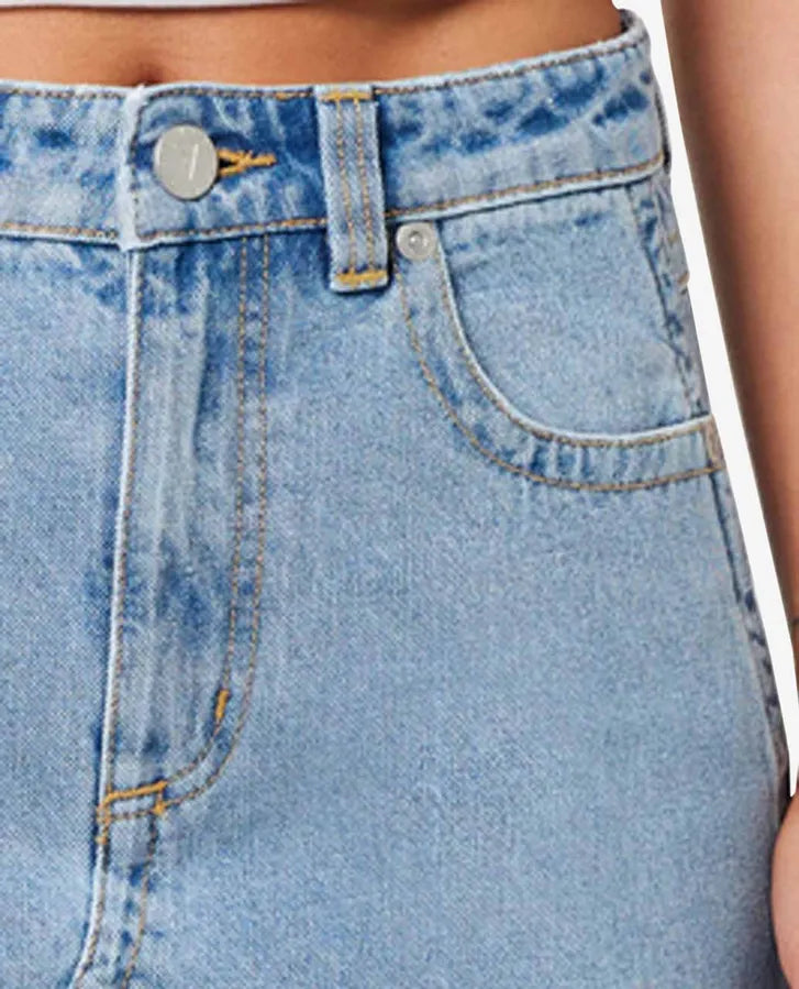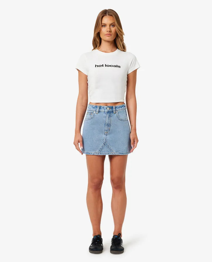 Meet your new denim obsession: this high-waisted skirt, a contemporary nod to iconic '90s style. Designed to sit comfortably at your natural waist, its flattering A-line silhouette and just-right mid-thigh length beautifully showcase your legs and footwear. Crafted from soft yet structured light blue stonewashed denim, and subtly branded with a Rip Curl x Abrand logo, this skirt is a versatile foundation for any look. Pair it with a baby tee and sneakers for effortless daytime cool, or elevate it with a fitted top and boots for a chic evening ensemble.