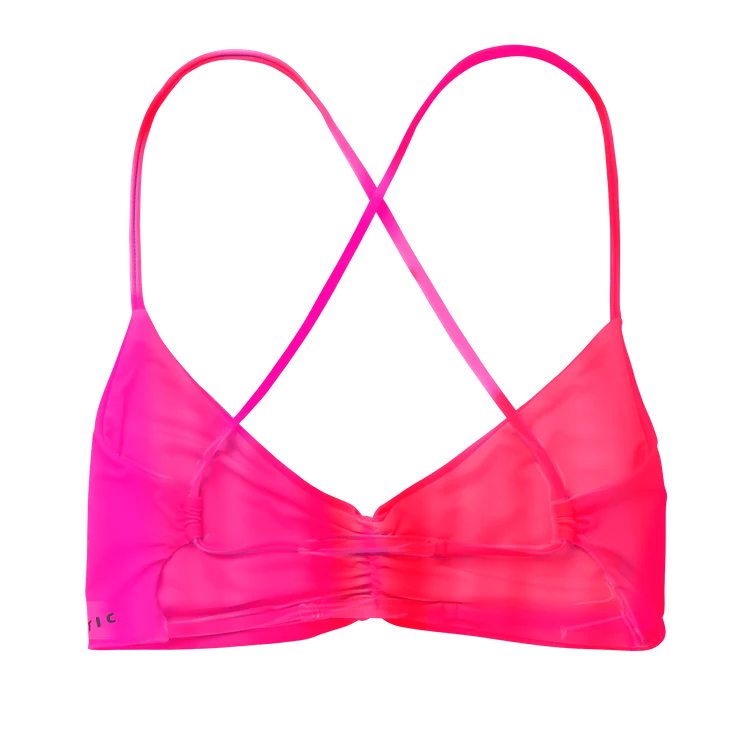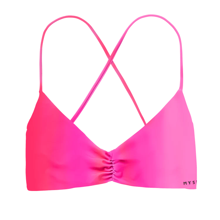 Bright coral pink, made to stand out. Bruna Kajiya's signature triangle bikini top features a cross-back design with adjustable straps, plus subtle gathering at the front for a flattering fit. A go-to for long beach days, summer sessions, and golden hour dips.