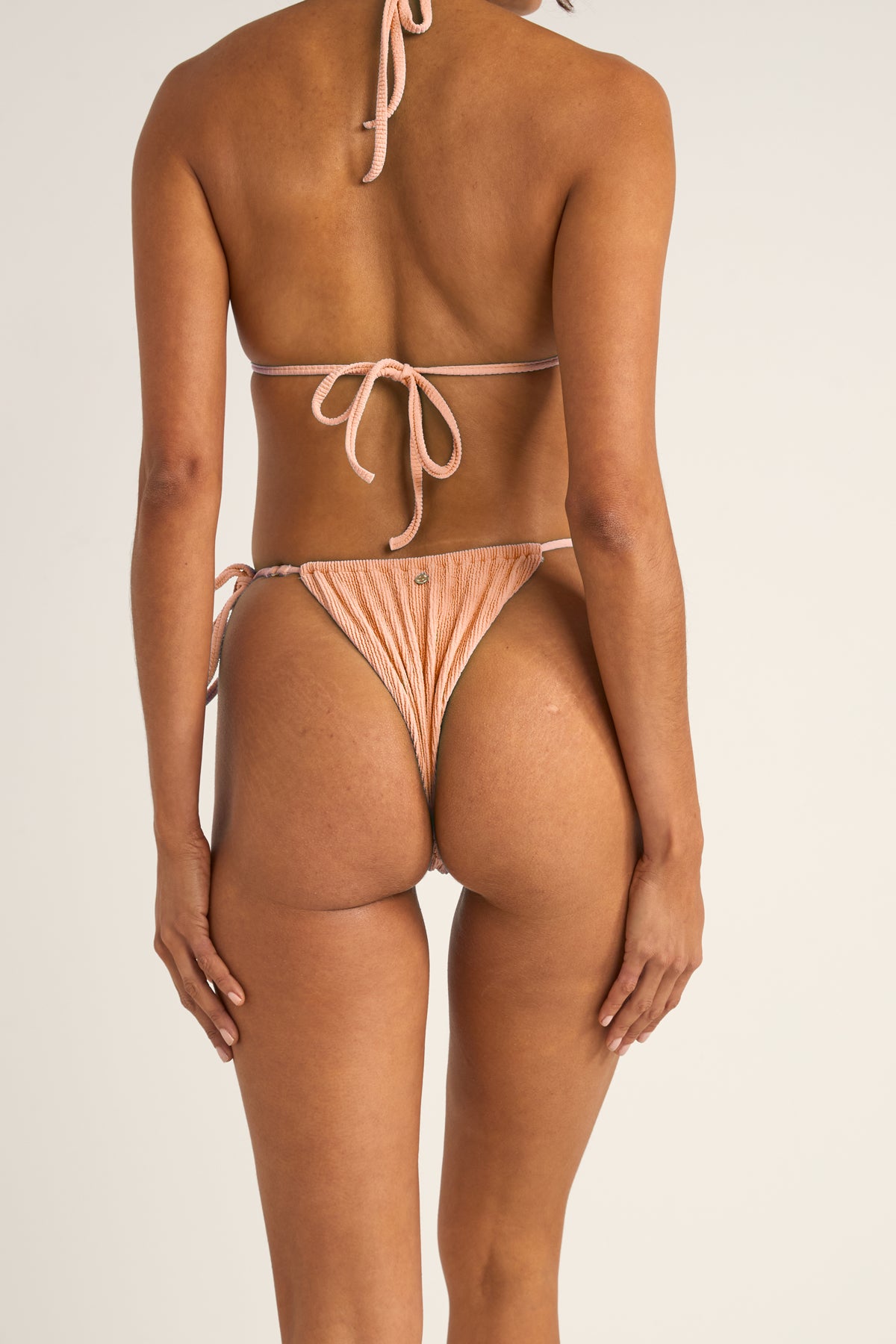 - MINIMAL COVERAGE, FUNCTIONAL GATHER AT FRONT AND BACK FOR CUSTOM FIT COVERAGE, METAL RING DETAIL AT SIDE STRING TIES, ADJUSTABLE STRING TIE AT SIDES WITH BEADS ON ENDS, ZIG ZAG STITCH AT LEG OPENING, BACK PANT PANEL LINED IN SELF FABRIC, METAL COIN LOG
